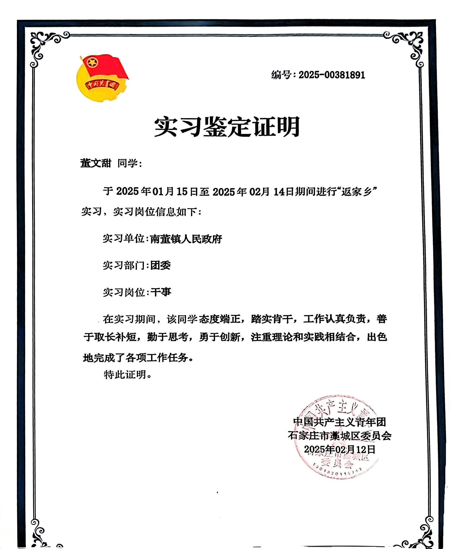 我負責文件整理與歸檔,把文件按年份、類別和重要性分類,初步了解了政府工作流程,認識到文件管理對政策落實和群眾利益的重要性。同時參與了關愛孤寡老人和留守兒童的志愿活動,為他們提供生活物資、陪伴和功課輔導,真切感受到了基層工作的溫度,也體會到政府在保障民生、促進社會和諧方面所做的努力。未來,我將帶著收獲的知識和感悟,不斷提升自己,積極參與家鄉建設,為南董鎮的發展添磚加瓦,讓家鄉變得更加美好。
