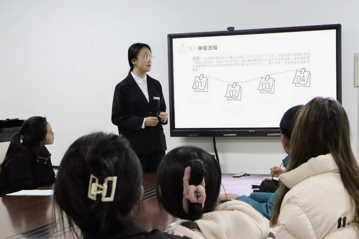 會上,學院分團委實踐與社團指導中心工作人員劉新竹對本部門近期工作開展情況進行了說明。張詩晗琪從社團評優、社團活動申報流程、社團注冊以及第二課堂加分等四個方面展開了詳細介紹。她講道,在社團評優方面共有“十佳學生社團”“優秀學生社團”“特色社團活動”“優秀社團干部”四個評選項目,并鼓勵大家積極推動社團工作的有序開展,充分發揮學生社團的作用,努力做出成績;在社團活動申報流程方面,張詩晗琪向大家詳細講述了完成活動審批表的四個步驟;在社團注冊方面,她對資金申請、社團更名申請、社團條幅宣傳申請、社團場地申請進行了詳細講解;她指出,第二課堂加分分別在學生思想成長、實踐學習、創新創業、志愿公益、文體活動等方面進行加分。