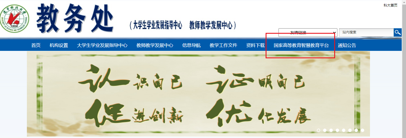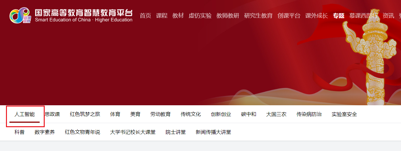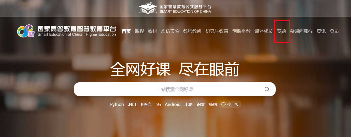 第一步,登錄國家高等教育智慧教育平臺,并點擊“專題”,地址為:https://higher.smartedu.cn///higher.smartedu.cn/,或通過學校教務處主頁跳轉鏈接。