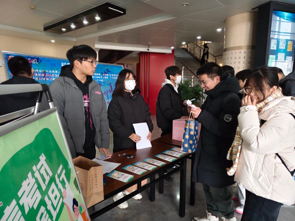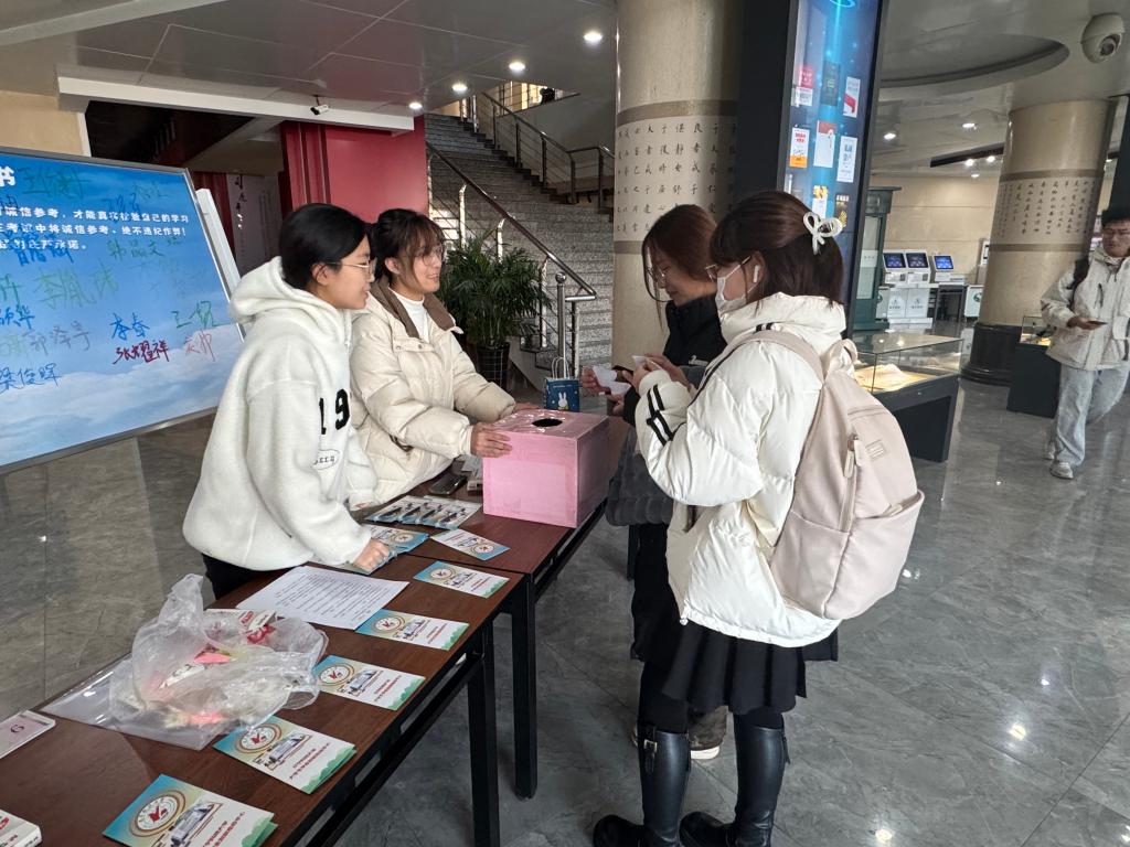 活動設計了“誠信考試承諾書簽字”、“誠信考試知識問答”和“拍照分享朋友圈”三個環節。同學們來到活動現場后,首先要在誠信考試承諾書留言板上簽下自己的姓名,鄭重承諾在考試中將誠信參考、絕不違紀作弊,以實際行動捍衛考試的公平與公正;接下來便進入到充滿挑戰的知識問答環節,同學們需要現場抽取與誠信考試相關的題目進行作答,題目內容涉獵廣泛,涵蓋了諸如誠信在學術領域所承載的核心價值、考試規則的詳細條款以及違背誠信考試原則后所面臨的嚴重后果等諸多方面,回答正確便可獲得一份精美禮品;最后,同學可以自愿拍攝活動相關照片發送至朋友圈,為宣傳誠信考試盡自己的一份力量。