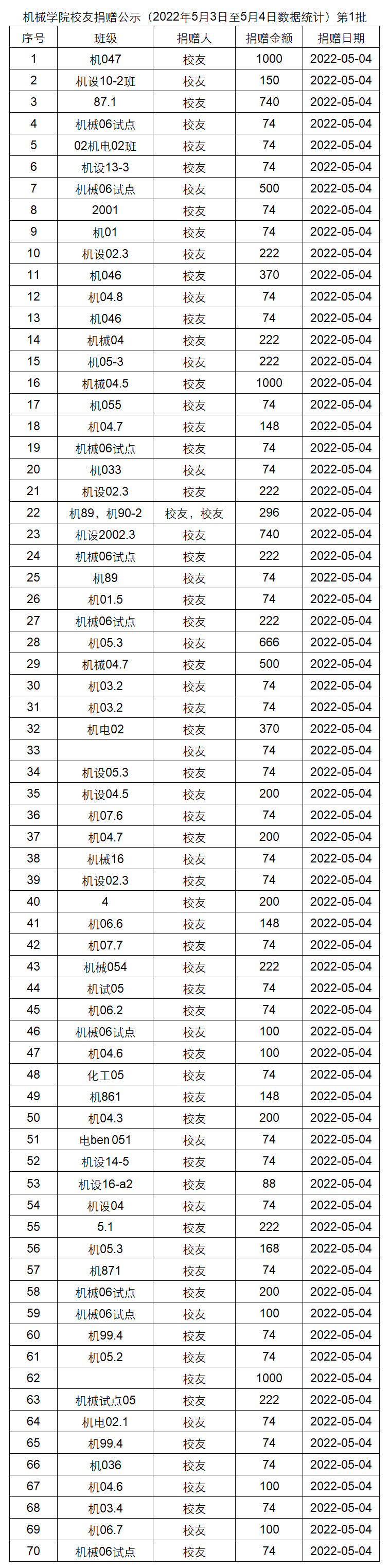 5月3-4日機械工程與自動化學院校友71人共捐贈14046元,個人捐贈公示如下:(隱去姓名)