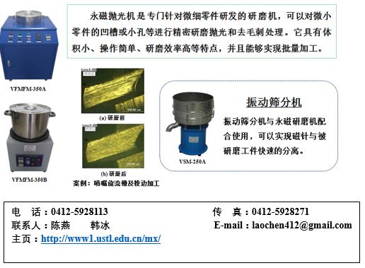精密與特種加工工藝及裝備科研團隊依托遼寧省復雜工件表面特種加工重點實驗室(遼寧省科技廳2017年審批),前身是成立于2010年5月的遼寧科技大學先進磨削技術研究所,是遼寧科技大學的骨干科研團隊之一,經過8年的不斷努力,目前已發展成為集基礎研究、應用開發到生產經營于一體的新型科研機構,憑借磁力研磨這一核心技術在國內復雜零件表面光整技術領域中異軍突起,技術能力處于國內領先水平。精密與特種加工工藝及裝備科研團隊在十年前就開展了磁研磨光整理論和磁研磨光整技術的研究,經過多年的努力,目前已經達到世界先進水平。先后承研了多個專項課題,在異形外圓表面、自由曲面、彎管內表面、微細零件表面等方面的磁研磨光整技術及相關研究領域都有一定的建樹,取得多項科研成果和專利,培養和造就了一批磁力研磨光整技術方面的研究人員。