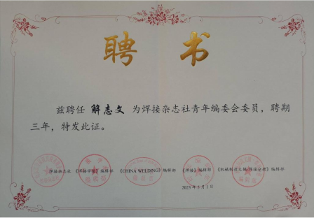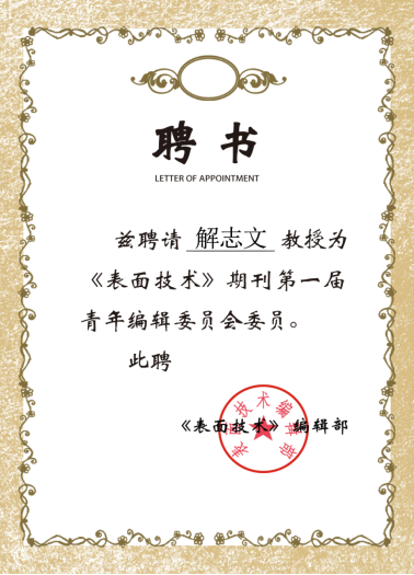 近日,《表面技術》《焊接雜志社》編輯部分別成立青年編輯委員會,我院解志文教授被聘為青年編輯委員會委員。