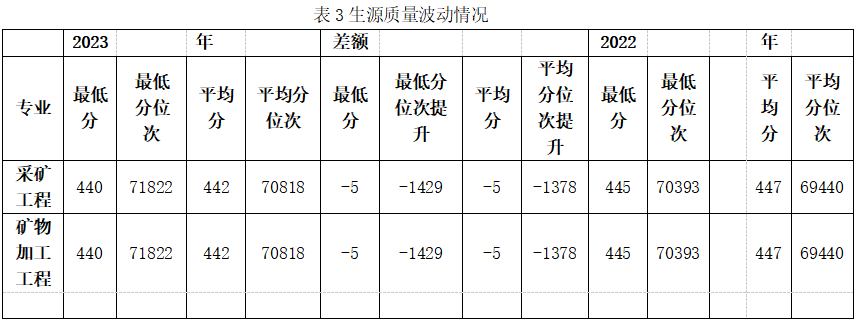 2021年至2023年,從平均分錄取位次來(lái)看,采礦工程、礦物加工工程,連續(xù)下降,采礦工程下降3796位,礦物加工工程下降2338位;從最低分錄取位次來(lái)看,采礦工程、礦物加工工程兩個(gè)專業(yè)位次下降1259位;從最高分錄取位次來(lái)看,采礦工程、礦物加工工程兩個(gè)專業(yè)位次下降6563位。