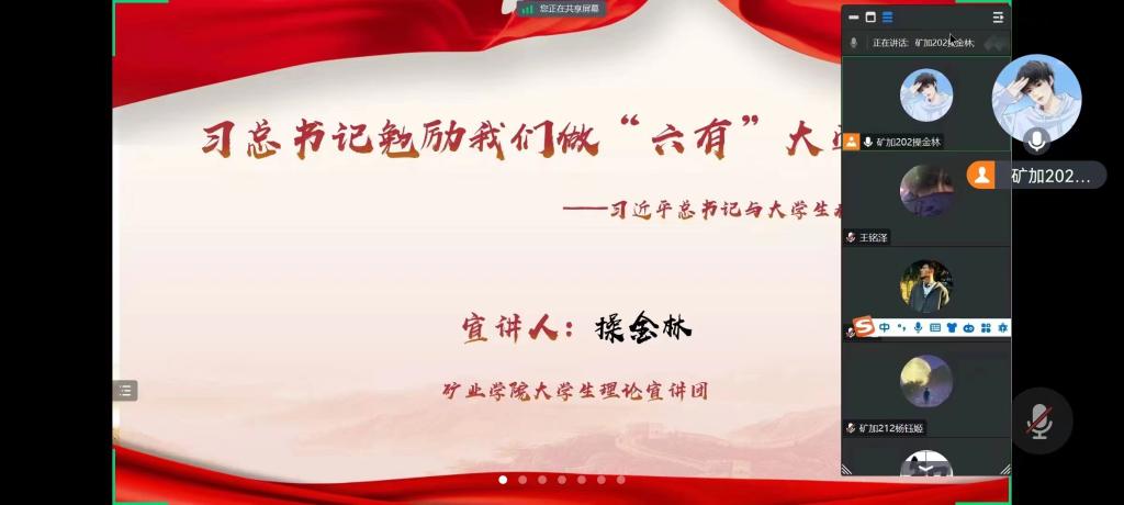 為深入貫徹落實習近平總書記重要講話精神,深切感悟新時代偉大成就,深入實施“時代新人鑄魂工程”、構建育人新生態,8月份期間,礦業工程學院于騰訊會議線上開展“習近平總書記與大學生在一起”主題系列宣講活動,本次宣講由院理論宣講團成員主講,礦業工程學院全體同學參加。