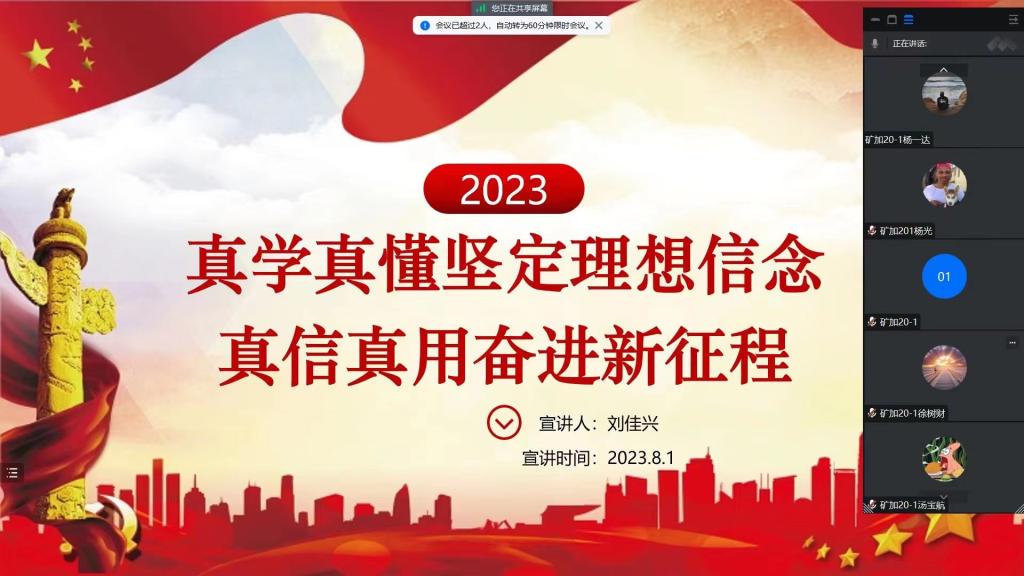 宣講活動進行了三次。8月1日,宣講人——礦加20-1劉佳興領學了《真學真懂堅定理想信念真信真用奮進新征程》,解讀了新時代青年學生干部的重要責任,表示一定加強理論學習、厚實理論功底。要堅定對馬克思主義的信仰,堅定對中國特色社會主義道路的信念,將偉大思想和理論成果轉化為內心的力量,去干事創業,作為擔當,在奮斗、奉獻中成長。