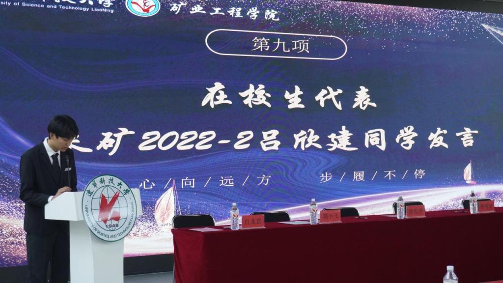 采礦 22-2 班呂欣建作為在校生代表發(fā)言,他難掩激動與不舍,向即將踏上新征程的學長學姐們致以最誠摯的祝福。他表示,作為在校生,他將以學長學姐為標桿,努力學習專業(yè)知識,積極參與實踐,傳承礦業(yè)人的精神,不負學院的培養(yǎng)與期望,也希望學長學姐們在未來一帆風順,常回母校看看。