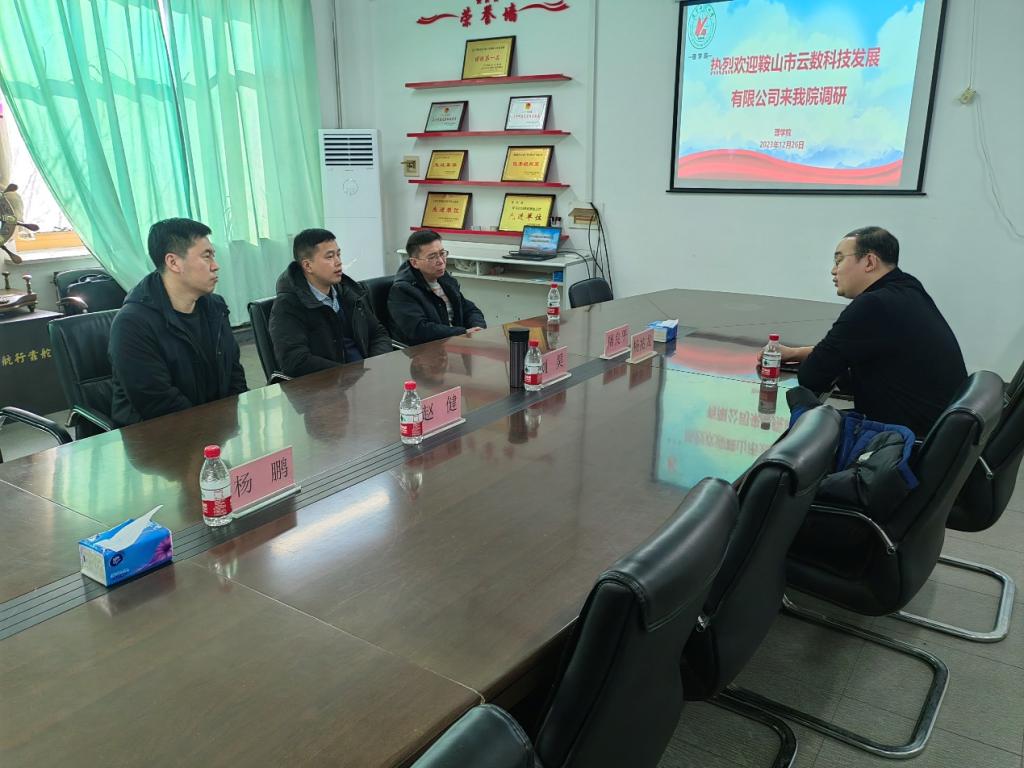 2023年12月26日上午,鞍山夢網云數據中心營銷總監楊兆龍來我院就校企合作事宜進行洽談交流。學院院長屠良平、副院長劉昊、數學系主任趙健、副主任楊鵬參加會議。