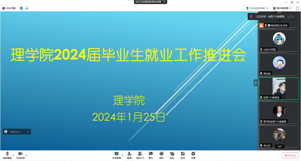 1月25日晚,理學院通過騰訊會議召開“2024屆畢業生就業工作推進會”,會議由高寶威老師主持,院黨委副書記侯立臣、團委書記宋薇、校友代表及2024屆全體畢業生參加。