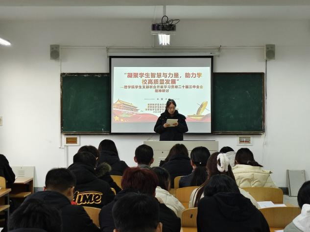 12月3日下午,理學院學生黨支部在明賢樓B402聯合召開“學習貫徹黨的二十屆三中全會精神”專題研討會,旨在為深入貫徹黨的二十屆三中全會精神,凝聚學生智慧與力量,推動學校高質量發展。會議由學生光學光電黨支部書記萬晴晴同志主持。