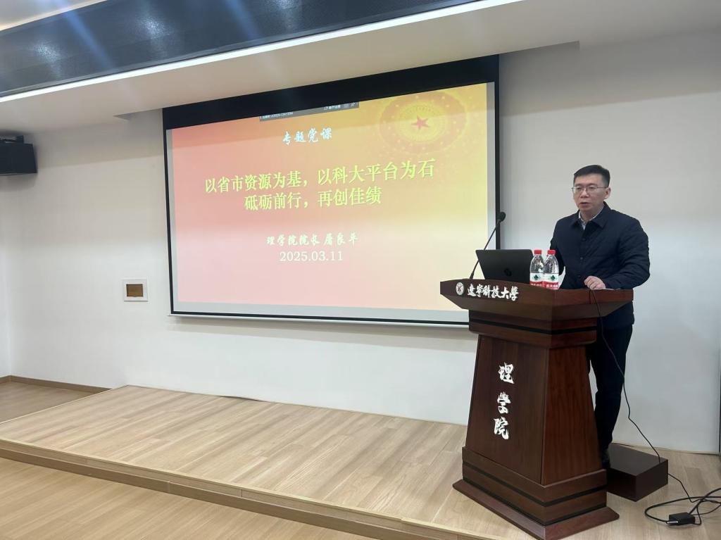 隨后,理學院院長屠良平以“以省市資源為基,以科大平臺為石,砥礪前行,再創佳績”為主題,為大家上了一堂生動而深刻的專題黨課。屠院長首先帶領大家一起學習了習近平總書記在遼寧考察時的重要講話精神,強調了要充分利用地域優勢,整合資源,推動學校各項事業的發展。接著,他傳達了孟勁松書記在2025年度工作會議的總結講話以及胡軍校長在2025年度工作會議的講話,總結2024年工作并部署2025年工作,確保全年工作任務高質量完成。鼓勵大家要堅定信心,勇于擔當,為推進教育強國建設、教育強省建設作出理學院貢獻。