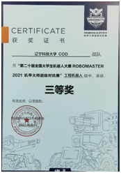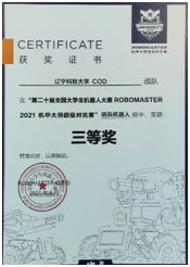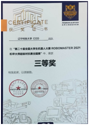 5月23日,為期6天的RoboMaster 2021 機甲大師超級全國對抗賽區域賽(北部賽區)在北京理工大學中關村校區落幕,在比賽中,榮獲RoboMaster 2021機甲大師超級對抗賽全國三等獎,哨兵機器人、工程機器人、英雄機器人、步兵機器人、工程機器人、空中機器人等單項比賽中獲得全國三等獎。