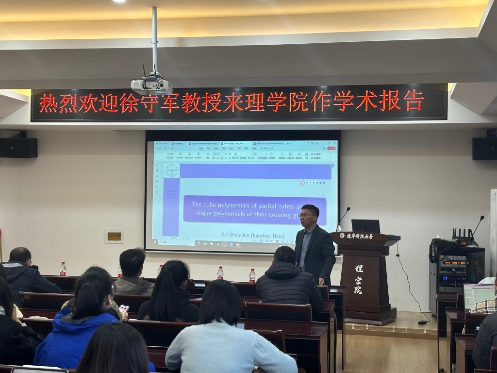 應我院邀請,11月4日下午,蘭州大學徐守軍教授在明賢樓B315作了題為《The cube polynomials of partial cubes and the clique polynomials of their crossing graphs》的學術報告。報告由理學院院長屠良平主持,數學專業研究生和相關教師聆聽了此次報告。