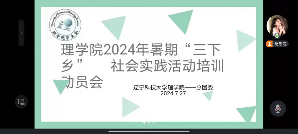 理學院7月27日至8月10日通過騰訊會議相繼召開了暑假“三下鄉”社會實踐活動動員和培訓會,會議由社團服務中心負責人趙思萌主持召開,學院團委書記宋薇老師以及各隊伍負責人和社團服務中心成員參加會議,同時還邀請了經法學院的高山同學進行經驗分享。