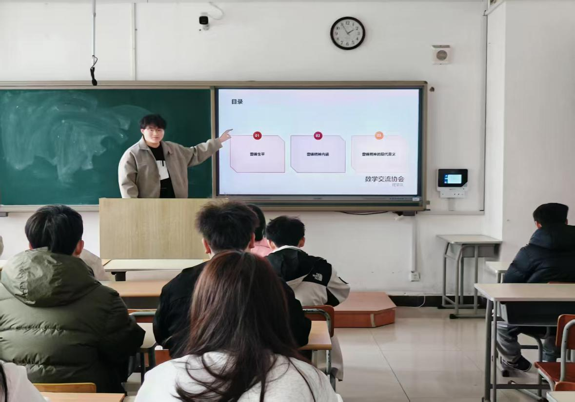 活動之日,教室座無虛席,協(xié)會成員們滿懷憧憬。卜永陽首先以雷鋒的成長軌跡和日常善行為切入點,引領(lǐng)同學(xué)們深切感悟雷鋒精神中無私奉獻(xiàn)、助人為樂的崇高境界。隨著PPT的緩緩展開,話題悄然過渡至數(shù)學(xué)領(lǐng)域,為同學(xué)們展現(xiàn)了一個全新的視角。