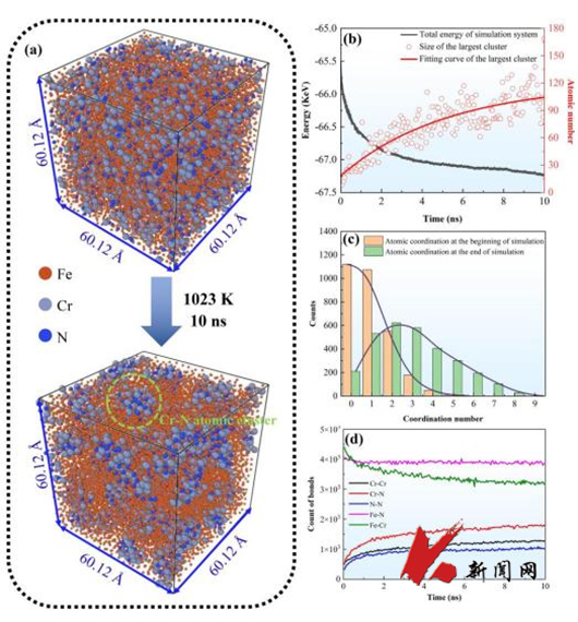 高氮奧氏體不銹鋼以其卓越的潛在性能受到冶金材料研究人員的廣泛關(guān)注。高氮不銹鋼中氮元素含量高于傳統(tǒng)不銹鋼,在熱加工過程中更易形成氮化物析出,導(dǎo)致出現(xiàn)基體貧鉻區(qū)、貧氮區(qū)和Cr2N析出相,降低鋼的強(qiáng)度和局部耐蝕性,對(duì)性能產(chǎn)生嚴(yán)重影響。團(tuán)隊(duì)使用LAMMPS分子動(dòng)力學(xué)模擬了高氮奧氏體不銹鋼熱加工過程中氮化鉻析出的微觀結(jié)構(gòu)演化和動(dòng)力學(xué),揭示了Cr2N相析出過程服從首先形成緊密Cr-N團(tuán)簇亞穩(wěn)中間相的二步形核機(jī)制,為優(yōu)化設(shè)計(jì)高氮不銹鋼中氮化鉻析出控制提供了理論指導(dǎo)。