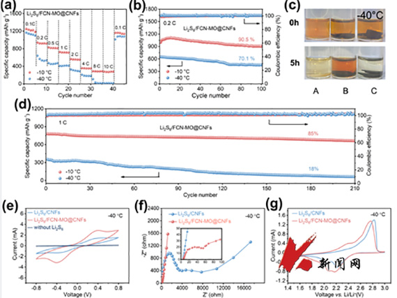 中熵合金催化劑復(fù)合的正極材料Li2S6/FCN-MO@CNFs展現(xiàn)了優(yōu)良的低溫特性,-40℃和0.1 C倍率下,初始放電容量可達(dá)1167.5mAh g-1,在0.2 C下進(jìn)行100次循環(huán)后,容量保持率70.1%。相關(guān)成果“Synergistic enhancement of Li-S battery low-temperature cycling performance by nano-sized uniformly compounded FeCoNi and MnO nanoparticles”在線發(fā)表于《Chemical Engineering Journal》。DOI:10.1016/j.cej.2023.141445。論文第一作者為化工學(xué)院2020級(jí)碩士研究生龐曉婉。