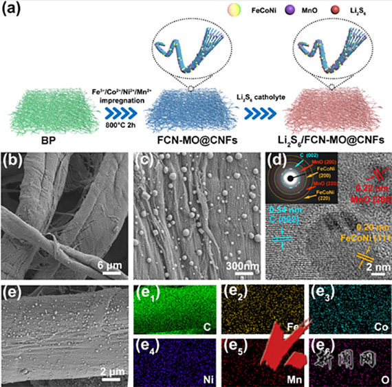 鋰硫電池具有高能量密度和低成本優(yōu)勢(shì),但低溫下鋰離子脫溶勢(shì)壘高,局部電荷轉(zhuǎn)移阻抗大、電池內(nèi)部發(fā)生強(qiáng)極化以及多硫化物溶解度降低,使其難以實(shí)現(xiàn)完全充放電。此外,低溫下多硫化物穿梭效應(yīng)導(dǎo)致鋰硫電池容量衰減更加嚴(yán)重。針對(duì)這些問(wèn)題,安百鋼教授團(tuán)隊(duì)和中科院過(guò)程工程研究所王寶研究員合作,利用原子級(jí)混合的中熵合金FeCoNi高催化活性和良好吸附性能,協(xié)同催化多硫化物轉(zhuǎn)化并加快電化學(xué)反應(yīng)。進(jìn)一步引入MnO納米粒子,錨定和提高FeCoNi納米粒子及其周?chē)嗔蚧餄舛龋瑢?shí)現(xiàn)多硫化物強(qiáng)吸附,促進(jìn)多硫化物催化轉(zhuǎn)化。