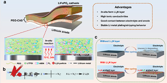 金屬鋰負(fù)極具有極高的理論比容量(3860mAh g-1)和超低的電化學(xué)勢(shì)(?3.04 V vs SHE)備受關(guān)注,然而在實(shí)際應(yīng)用過(guò)程中,由于其界面不穩(wěn)定性等原因仍面臨巨大挑戰(zhàn)。安百鋼教授團(tuán)隊(duì)與學(xué)校特聘教授,南京理工大學(xué)孫呈郭教授合作,利用原位熱分解2,2′-偶氮二異丁腈(AIBN)添加劑,在聚合物固態(tài)電解質(zhì)與金屬鋰負(fù)極之間構(gòu)建了一種穩(wěn)定高效的氮化鋰(Li3N)中間層,有效解決了電解質(zhì)與電極之間界面處離子電導(dǎo)率低、接觸差、不穩(wěn)定等問(wèn)題。相關(guān)成果“Thermal Decomposition Assisted Construction of Nano-Li3N Sites Interface Layer Enabling Homogeneous Li Deposition”在線發(fā)表于《ChemSusChem》。DOI:10.1002/cssc.202202220。論文第一作者為化工學(xué)院2021級(jí)博士研究生李洪洋。