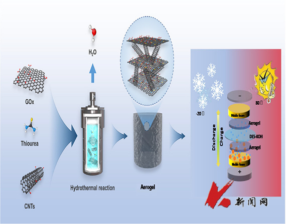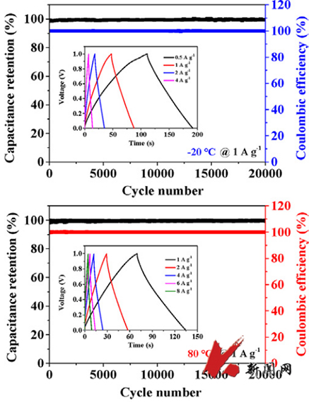 超級電容器,作為重要的電化學儲能裝置代表之一,由于其高比容量、長循環時間和快速充電/放電等優點在許多領域具有廣闊的應用前景。然而,在一些工況條件下,超級電容器需要在極端溫度下運行,因此,開發可在非常溫條件下工作的高效電極和電解質是超級電容器能否實現商業多元化的重要研究目標。該項研究介紹了一種利用簡單的自組裝方法制備三維碳納米管/還原氧化石墨烯氣凝膠材料的方法,三維氣凝膠可同時作為對稱超級電容器的正極和負極。所制備的超級電容器不僅在室溫下,而且在極端溫度(-20℃至80℃)下表現出優異的超級電容性能。以KOH作為電解質,在25℃和80℃時分別達到107.8和128.2 F g-1,用深共晶溶劑作為電解質在-20℃和60℃時分別達到80.0和144.6 F g-1。重要的是,組裝后的超級電容器在寬溫度范圍內經過20000次充電/放電測試循環后,電容保持率和庫侖效率幾乎保持不變。這項工作為極端溫度下靈活運行的高性能超級電容器的制備提供了可能。(供稿單位:化工學院 圖片來源:化工學院)