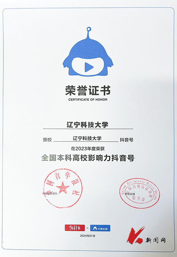 1月24日,由中國青年報社、共青團黑龍江省委員會、中青校媒主辦的貫徹“兩個結合”——全國高校可視化交流會在黑龍江大學舉辦。會上發布了2023年度全國本科高校抖音號影響力指數(TOP100)榜單,遼寧科技大學官方抖音號入圍,抖音作品《等花開,總要逛一逛遼科大吧!》入選全國本科院校抖音號熱門視頻TOP100。