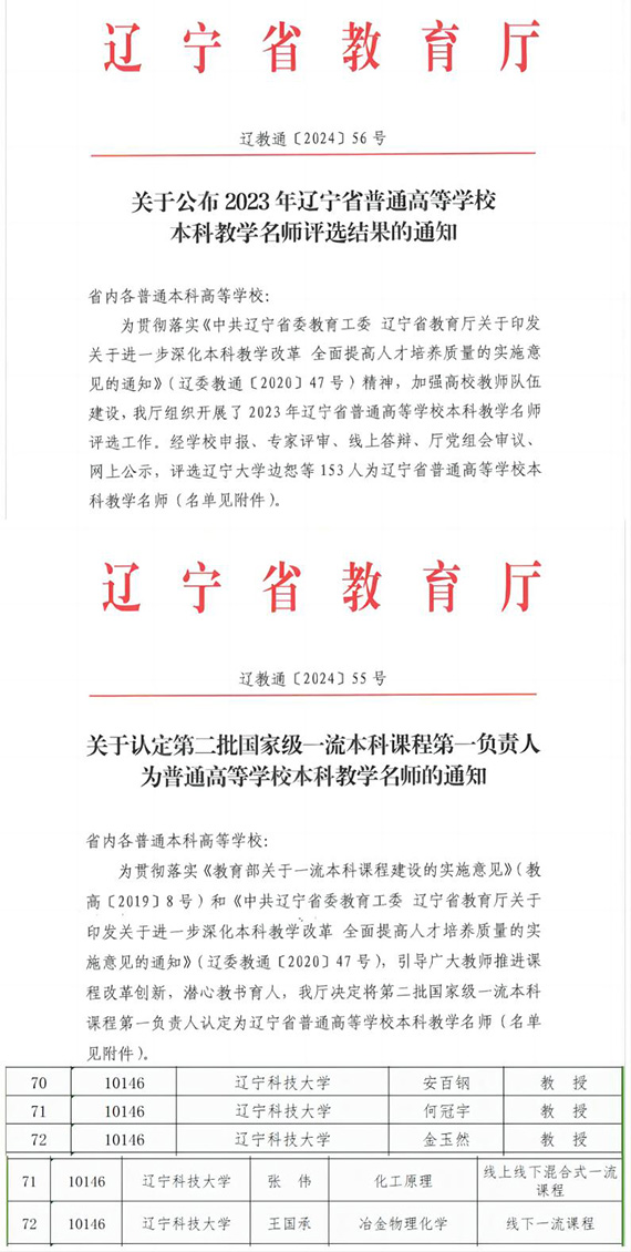 近日,根據遼寧省教育廳《關于公布2023年遼寧省普通高等學校本科教學名師評選結果的通知》(遼教通〔2024〕56號),遼寧科技大學化學工程學院安百鋼教授、工商管理學院金玉然教授、藝術學院何冠宇教授獲評2023年遼寧省普通高等學校本科教學名師。此外,根據遼寧省教育廳《關于認定第二批國家級一流本科課程第一負責人為普通高等學校本科教學名師的通知》(遼教通〔2024〕55號),材料與冶金學院王國承教授、化學工程學院張偉教授名列其中,學校累計5人獲評2023年度省級本科教學名師,創單年獲評人數新高。