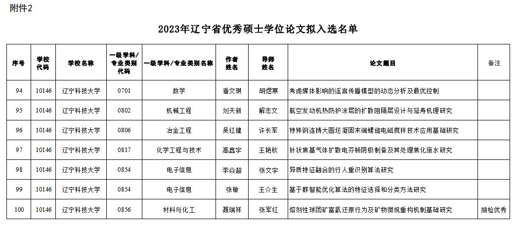 近日,遼寧省教育廳官網(wǎng)公布了2023年遼寧省優(yōu)秀博士、碩士學(xué)位論文評選結(jié)果,遼寧科技大學(xué)8篇學(xué)位論文被評為省優(yōu)秀學(xué)位論文。其中,學(xué)校申報的7篇學(xué)位論文(1篇博士學(xué)位論文、6篇碩士學(xué)位論文)全部獲得優(yōu)秀,另一篇獲得優(yōu)秀的碩士學(xué)位論文是在抽檢中被確定為優(yōu)秀,獲獎?wù)撐钠獢?shù)再創(chuàng)學(xué)校歷史新高。
