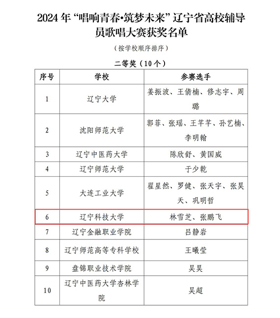 7月3日—5日,由省委教育工委、省教育廳舉辦的2024年“唱響青春·筑夢未來”遼寧省高校輔導員歌唱大賽在沈陽音樂學院舉行。來自遼寧科技大學的2名輔導員組隊參賽并榮獲二等獎,入選優秀節目展演環節。