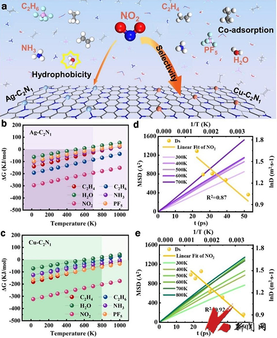 據了解,為避免鋰電池在極端條件下產生熱失穩問題而造成影響,亟需一種高靈敏度、高選擇性的氣體傳感器對電池熱失穩前釋放的微量氣體NO2、PF5和NH3等進行預警。該研究采用第一性原理計算方法,利用Cu和Ag修飾的碳氮單層材料(Cu/Ag-C2N1)對多種危險性氣體共存環境進行了氣敏性能分析。研究表明,基于態密度計算,Cu-C2N1材料對NO2表現出高選擇性和敏感響應,并且有效避免了濕度的干擾。此外,該研究強調了吉布斯自由能和愛因斯坦擴散方程在分析氣體傳感器應用范圍和氣體擴散活化能壘上的重要作用。同時,在不影響選擇性、響應性和穩定性的情況下,過渡金屬相對于貴金屬擁有成本上的優勢。該研究為設計高選擇性氣體傳感器和深入理解氣固界面相互作用機理提供了新思路。