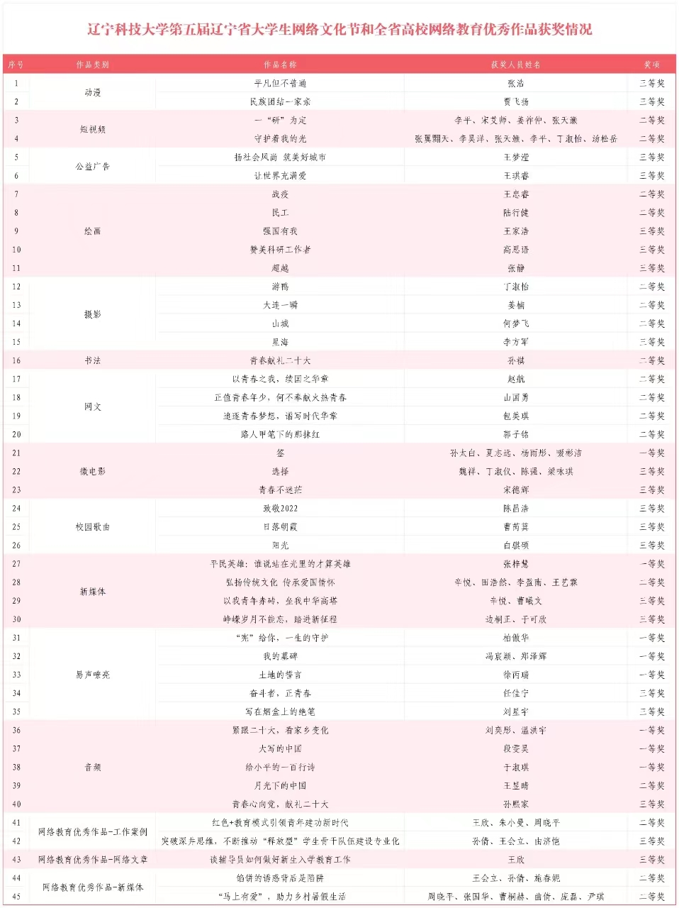 近日,遼寧省高校網絡思想政治工作中心公布了第五屆遼寧省大學生網絡文化節和全省高校網絡教育優秀作品推選展示活動評選結果,遼寧科技大學45項作品分別在大學生網絡文化作品和高校網絡教育優秀作品推選展示活動中獲獎,獲獎總數排名第五。