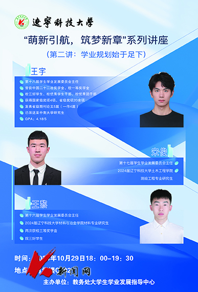 10月29日,遼寧科技大學教務處大學生學業發展指導中心面向2024級新生舉辦的“萌新引航 筑夢新章”系列講座第二講《學業規劃始于足下》在博學樓C302教室開講。學生學業發展委員會歷屆主任王宇、宋俊、王黎為學校300余名新生作講座。