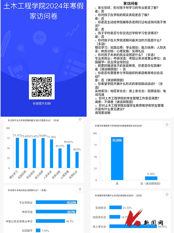 寒假期間,遼寧科技大學(xué)土木工程學(xué)院多措并舉、立體組網(wǎng),持續(xù)推進(jìn)家校聯(lián)動(dòng)工作,充分發(fā)揮學(xué)院領(lǐng)導(dǎo)班子成員、班主任(學(xué)業(yè)指導(dǎo)教師)、輔導(dǎo)員的積極性、主動(dòng)性和創(chuàng)造性,靈活選取實(shí)地走訪、網(wǎng)絡(luò)家訪和電話交流等形式,結(jié)合各年級(jí)學(xué)生特點(diǎn)和成長(zhǎng)實(shí)際分別召開家長(zhǎng)會(huì),并圍繞課業(yè)評(píng)估、關(guān)注熱點(diǎn)、就業(yè)指導(dǎo)、滿意度測(cè)評(píng)等內(nèi)容開展問卷調(diào)查,依托精準(zhǔn)的數(shù)據(jù)支撐和貼切的指導(dǎo)幫扶來提升家校教育聯(lián)動(dòng)質(zhì)量。