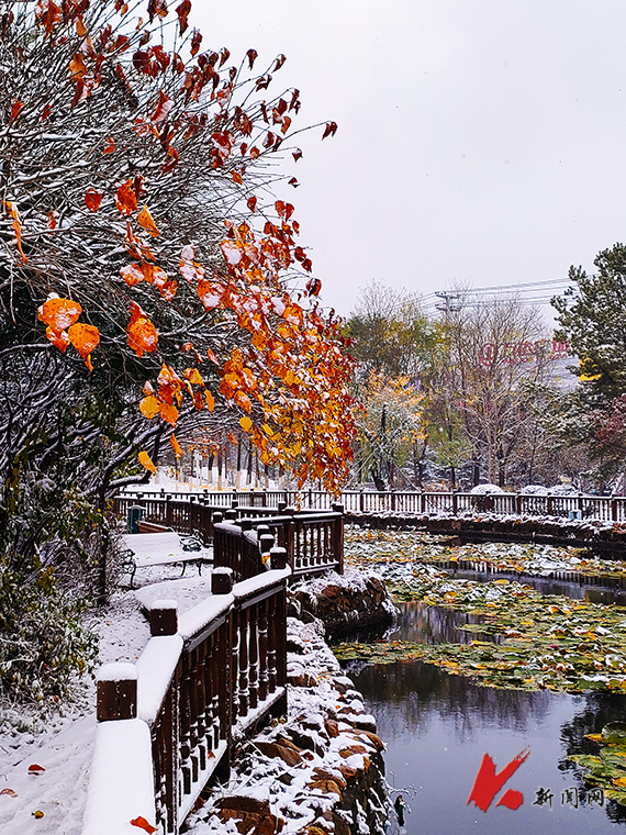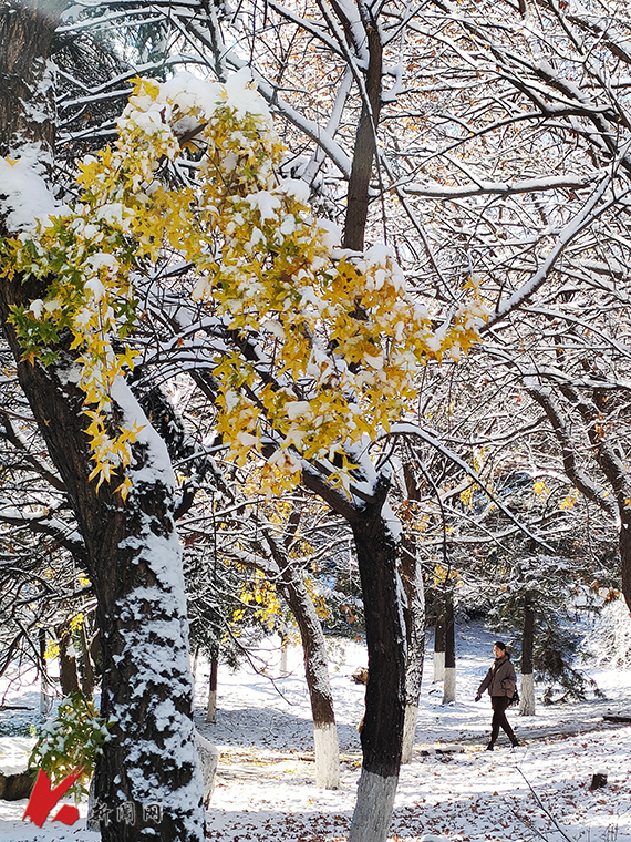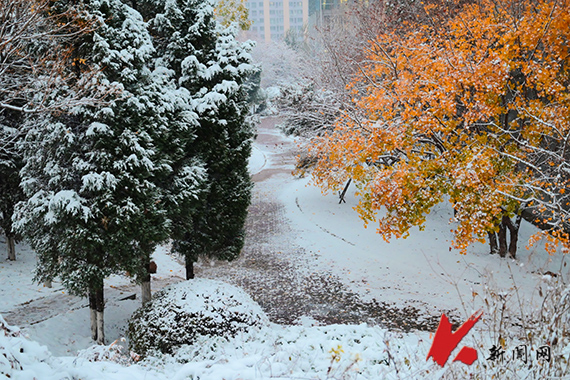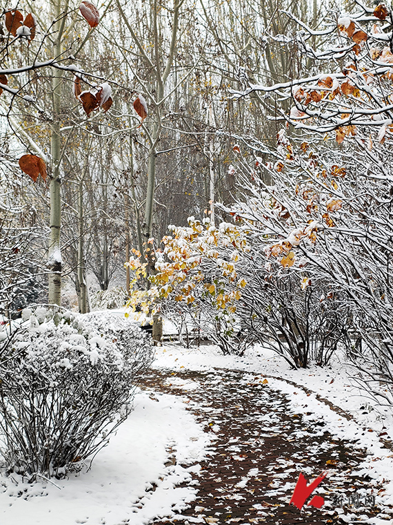 秋意還未完全退去,冬天終于在人們的期盼中姍姍來臨了。飄落的雪花中夾雜著片片金燦燦、火紅火紅的葉子,給白雪的畫布增添了繽紛的顏色,這個(gè)冬天更加別具一格。