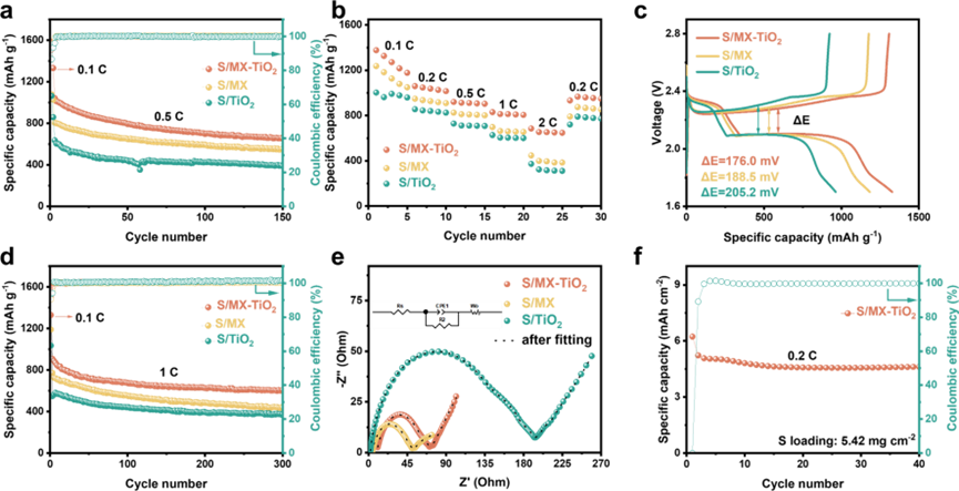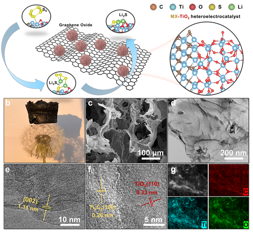 鋰硫電池因其高理論能量密度和低成本,被認為是下一代儲能技術的潛力候選。然而,其廣泛應用面臨多重挑戰,如硫化物的穿梭效應和氧化還原反應動力學緩慢。為解決這些問題,該研究設計了一種氧化石墨烯負載MXene-TiO2異質結氣凝膠用作鋰硫電池正極,通過強化與多硫化物的錨定和催化轉化來改善電池性能。該材料相比于單一的MXene和TiO2催化劑,具有高的電子導電性、合適的吸附能力和豐富的活性位點。錨定和催化轉化多硫化鋰的同時,降低了Li2S的勢壘,對其快速均勻沉積和分解起到了極大的促進作用,實現多硫化鋰的吸附-擴散-轉化之間的動態平衡。實驗研究證實,該材料具有高比容量、高倍率性能和長循環穩定性,并且在高硫負載量下具有優異的循環穩定性。