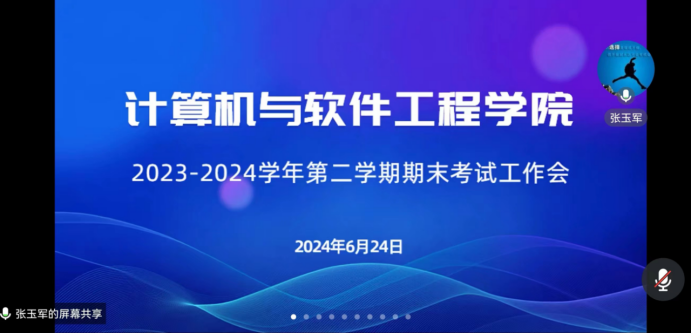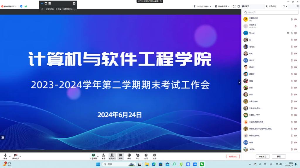 2024年6月24日晚,學院召開2023-2024學年第二學期期末考試工作線上會議,會議由教學副院長張玉軍主持,學院領導班子成員及專任教師、綜辦及學辦相關工作人員參會。