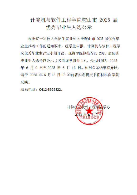 計算機與軟件工程學院鞍山市 2025 屆 優秀畢業生人選公示
