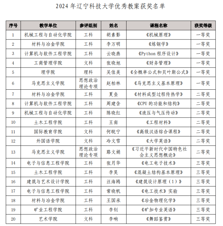 9月2日,學院工會組織教師參加的2024年遼寧科技大學優秀教案評選比賽公布結果,獲一等獎1項、二等獎1項,