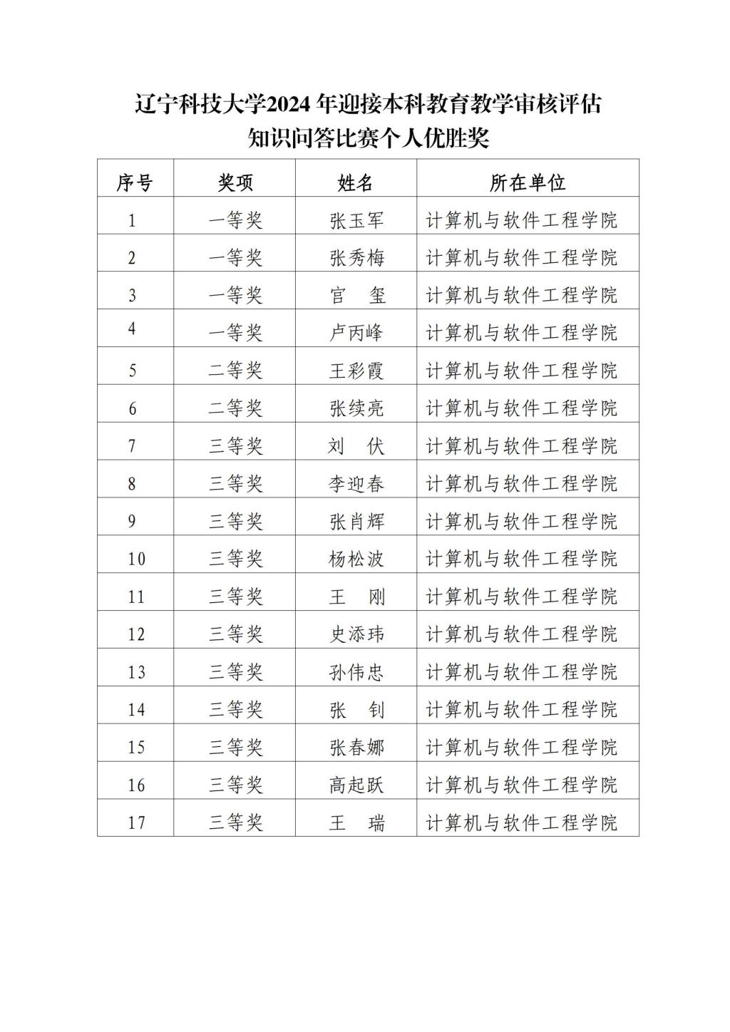 10月29日,學院工會組織教職工參加的學校迎接本科教育教學審核評估知識問答比賽公布表獎名單,17人獲得個人優勝獎: