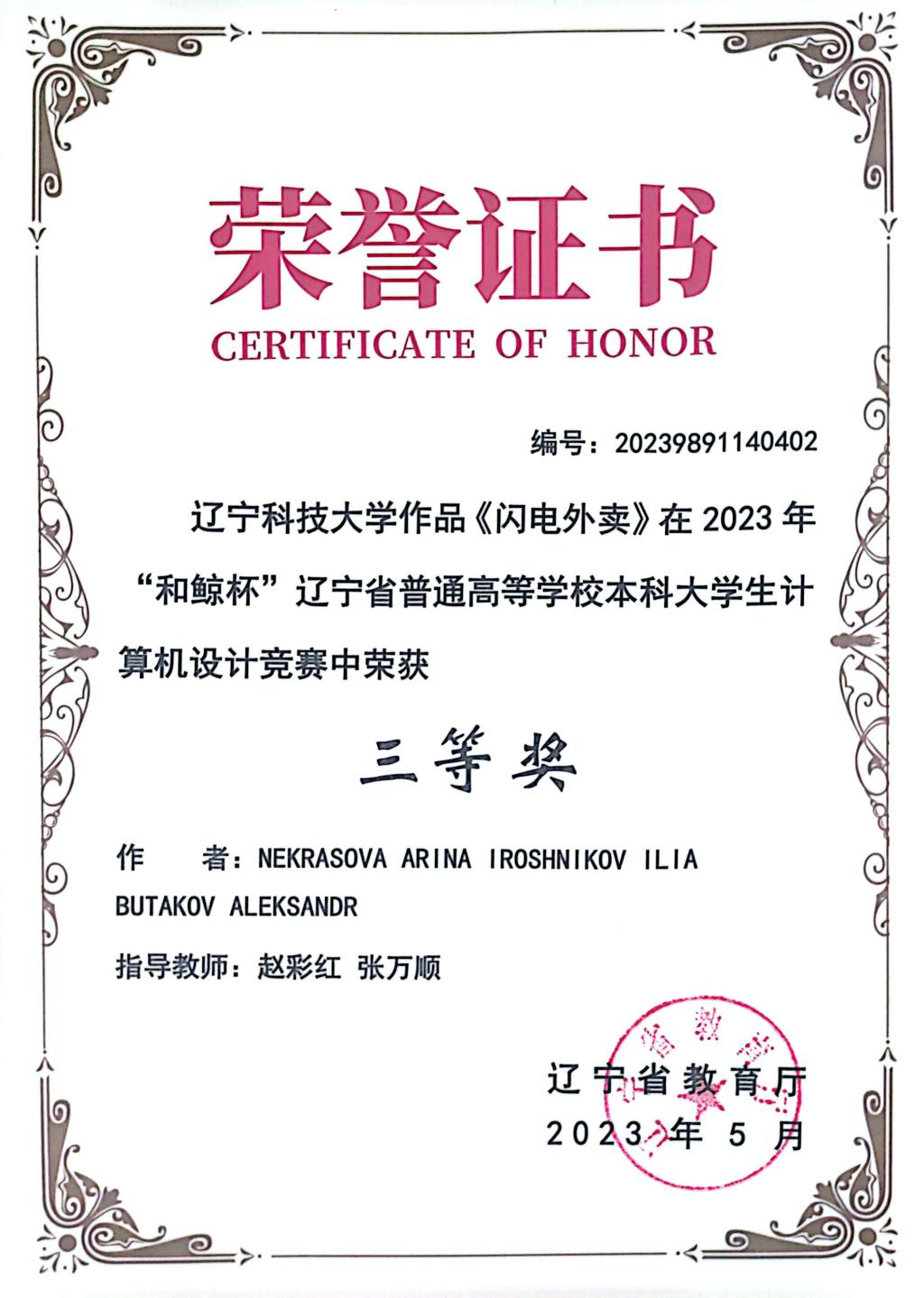 近日獲悉,我院留學生NEKRASOVA ARINA、IROSHNIKOV ILIA、BUTAKOV ALEKSANDR在“2023年中國大學生計算機設計大賽”中取得省賽(暨2023年“和鯨杯”遼寧省普通高等學校本科大學生計算機設計競賽)三等獎的好成績。作品《閃電外賣》用留學生的視角介紹中國外賣現(xiàn)狀,講述透過外賣看到的中國發(fā)展速度,以及中國人感恩自然,尊重勞動者,愛惜食物,重視親情,勤勞奮進的精神風貌,有助于觀者更深刻地理解當代中國。