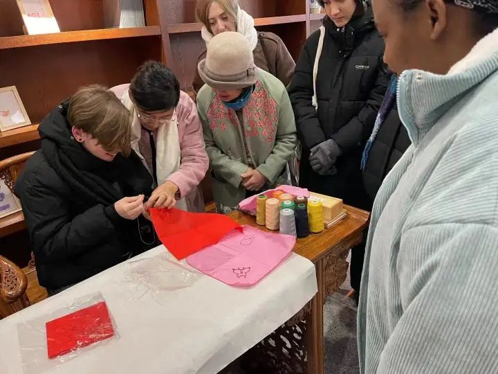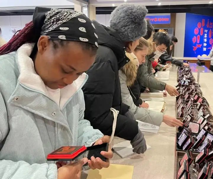 在鞍山市博物館,現(xiàn)場講解員給留學(xué)生們講解了鞍山的遠(yuǎn)古文明、近代文明等,展示了不同歷史背景中的文化內(nèi)涵。在尹航滿族刺繡館,留學(xué)生們拿起針線,親手體驗(yàn)和感受國家級非物質(zhì)文化遺產(chǎn)——滿繡的魅力。在鞍山印章博物館,大家興致盎然,爭先恐后尋找自己感興趣的館藏文物印章以及鞍山的地標(biāo)建筑,印在自己帶來的筆記本上。在鞍山玉石藝術(shù)館,留學(xué)生們親眼見到了館藏的岫巖玉、和田玉、緬甸翡翠等世界各地奇石瑰寶以及美輪美奐的玉雕作品;在千山田黃藝術(shù)館,見到了榮獲中國百花金獎的“松月圖”,留學(xué)生們不禁嘖嘖稱奇;在中國北方手工機(jī)繡藝術(shù)館,大家則體驗(yàn)了北方機(jī)繡的獨(dú)特技藝。