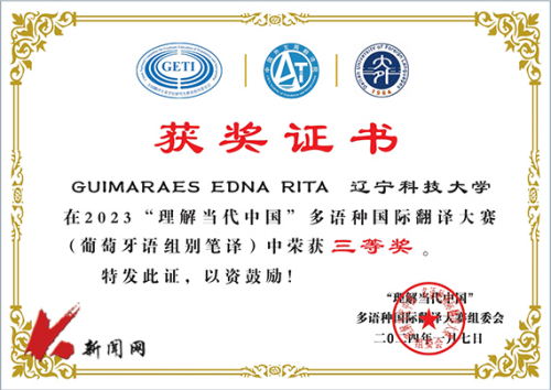 近日,由全國(guó)翻譯專(zhuān)業(yè)學(xué)位研究生教育指導(dǎo)委員會(huì)、中國(guó)翻譯協(xié)會(huì)對(duì)外傳播翻譯委員會(huì)、中國(guó)外文局翻譯院、遼寧省教育廳指導(dǎo),大連外國(guó)語(yǔ)大學(xué)主辦,大連外國(guó)語(yǔ)大學(xué)高級(jí)翻譯學(xué)院、多語(yǔ)種翻譯研究中心承辦的2023“理解當(dāng)代中國(guó)”多語(yǔ)種國(guó)際翻譯大賽獲獎(jiǎng)結(jié)果公布。遼寧科技大學(xué)來(lái)華留學(xué)生GUIMARAES EDNA RITA(安哥拉籍)榮獲三等獎(jiǎng)。