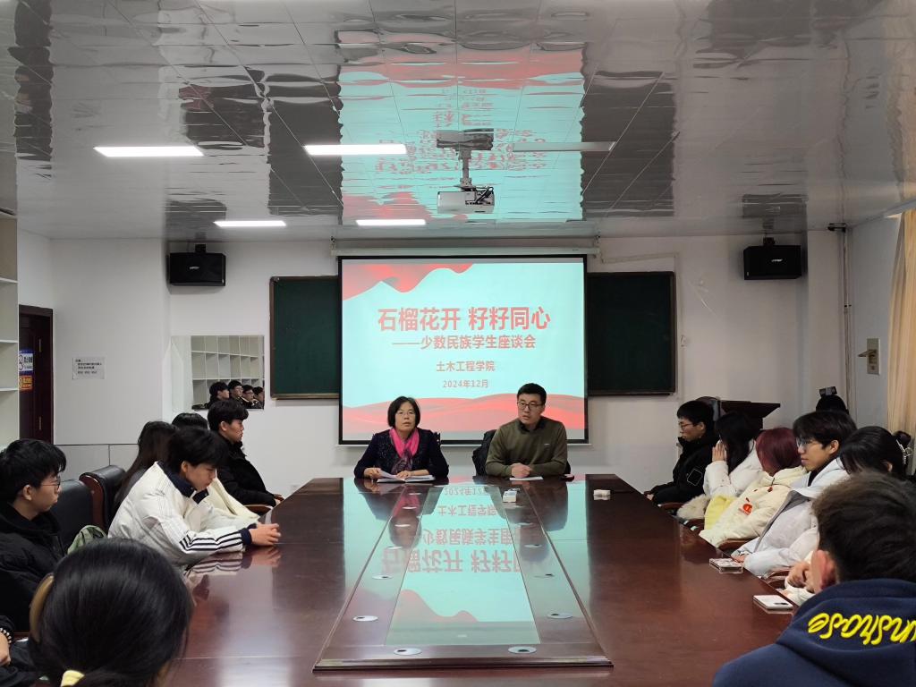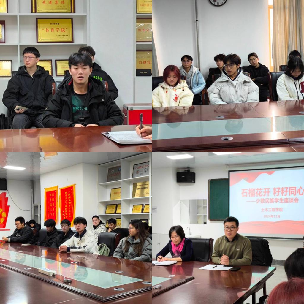 12月5日,土木工程學(xué)院于博觀樓A408會(huì)議室召開“石榴花開 籽籽同心”少數(shù)民族學(xué)生代表座談會(huì)。學(xué)院黨委書記周曉平、學(xué)院團(tuán)委副書記李振南與2024級34名少數(shù)民族學(xué)生代表共同參加座談會(huì)。會(huì)議由李振南主持。