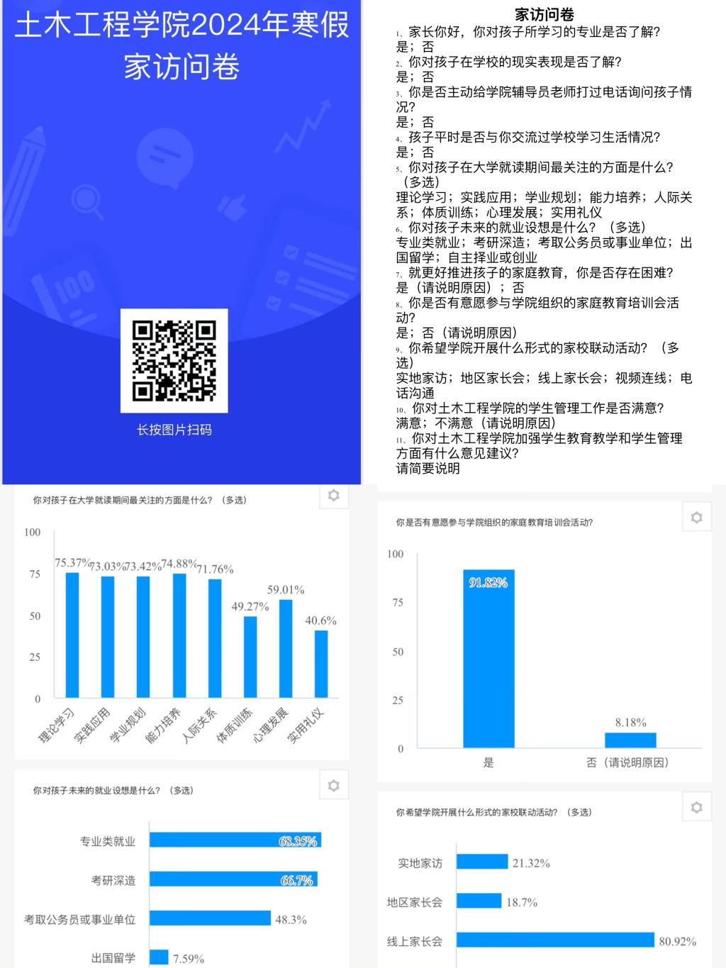 土木工程學院歷來高度重視家校聯動工作,秉持“1+2+2+3+N”工作思路,構建“學院領導班子統籌引領,專業課教師積極參與,輔導員全員參加”的工作機制,專項召開家訪工作動員部署會,聯合學校發展規劃處、機關黨委成立“暖心助學”家訪團,走訪慰問海城市接文鎮和臺安縣黃沙坨鎮重點幫扶學生,并先后對鞍山市區和海城地區、沈陽市、朝陽市等生源集中區域開展實地走訪。與此同時,學院以年級為單位分別召開家長會并設計推進《土木工程學院2024年家訪問卷》,詳細摸底掌握家長們的意見建議,為后續精準化開展教育幫扶奠定基礎。截至目前,已累計實地走訪學生家庭16戶、線上或電話家訪68戶,開展地區家長會1場、線上家長會7場,收回有效調查問卷1100余份,實現了較為突出的“攜愛同行,共育新人”效果。