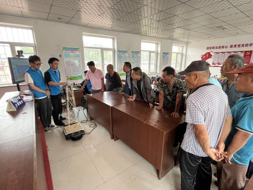 在凌源市水務局水利工程質量監督負責人王慶的帶領下,團隊依托專業知識在大房身村黨群服務中心,通過理論講解和試驗演示,向村民們生動地講述了災害預警和防震減災的知識、以及遇到突發情況自我保護的技巧。
