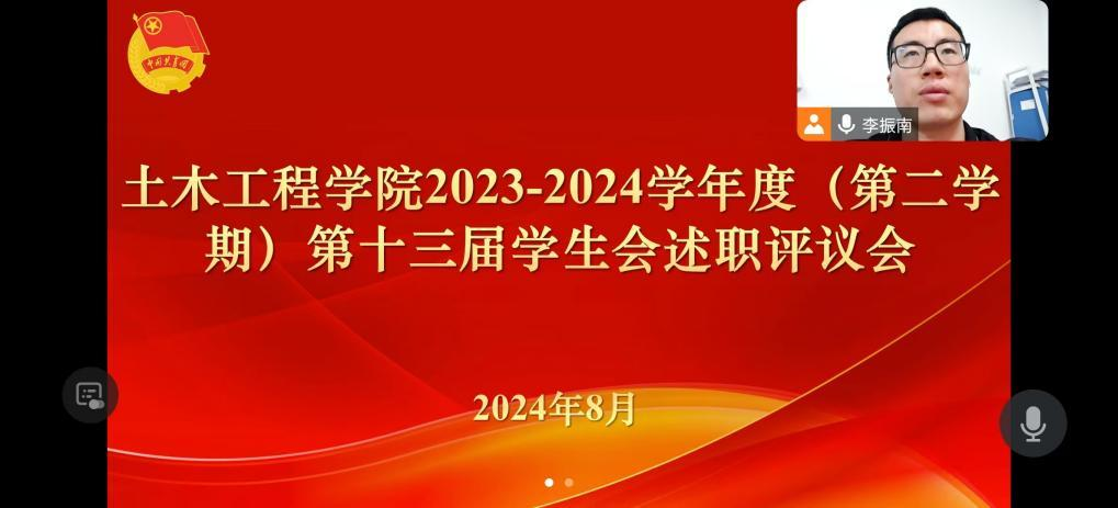 為進一步加強土木工程學院學生會建設,發揮學生會聯系廣大同學的橋梁紐帶作用,推動學生 會組織管理工作科學化、規范化,8月14日,土木工程學院2023-2024學年度(第二學期)第十三屆學生會述職評議會在線上召開。土木工程學院黨委副書記王一、團委副書記李振南以及學生會全體 成員參加評議會。