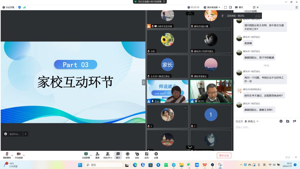 周衛(wèi)紅在宣講中詳細(xì)介紹了學(xué)院近年來在教學(xué)科研、服務(wù)社會(huì)、交流合作等方面取得的顯著成就,及著力推進(jìn)建設(shè)智能建造產(chǎn)業(yè)學(xué)院和土木類“3+1”人才培養(yǎng)模式的創(chuàng)新舉措,在深入講解當(dāng)前就業(yè)形勢、職場現(xiàn)狀、就業(yè)政策等方面內(nèi)容的同時(shí),他建議同學(xué)們轉(zhuǎn)變就業(yè)觀念、樹立就業(yè)信心,提高自身素養(yǎng)、拓寬就業(yè)渠道。互動(dòng)交流中,周衛(wèi)紅細(xì)致解答了家長們提出的考研調(diào)劑策略、求職的前期準(zhǔn)備、就業(yè)心態(tài)調(diào)整和應(yīng)聘技巧等問題,并為在就業(yè)求職過程中遇到疑惑和困難的學(xué)生提供了有針對性的指導(dǎo)和幫助。