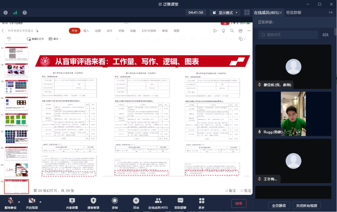 李磊基從碩士期間工作情況、遼寧省優秀碩士論文經驗、期刊論文撰寫、申博經驗四方面做了理論與實踐相結合的分享。在介紹完自身碩士期間的研究成果后,他重點分享了獲獎秘籍,從碩士學位論文專家評分體系和標準入手,逐一分析如何從論文選題、文獻綜述、研究方法等方面提高學位論文質量。隨后,他分享了學位論文和期刊論文寫作“干貨”,從文章結構、文字表述、圖表制作等如何寫,到科研規劃、查閱文獻、寫作訓練、團隊協作等如何做,他都一一詳細講述,贏得了所有同學的“點贊”。最后,他對如何順利考博申博提出了三點建議:一是要做好規劃,積極參與學術活動,提升學術敏感度;二是提高自己科研能力,豐富科研成果;三是要主動與多個導師取得聯系,增加錄取機會,如可提前申請參加夏令營、進組學習。