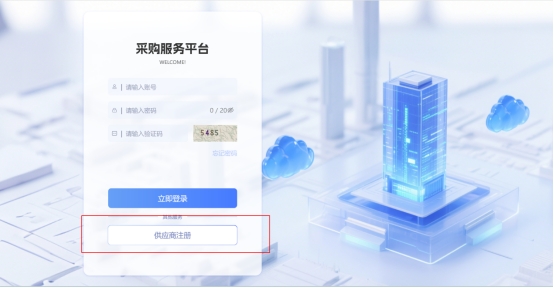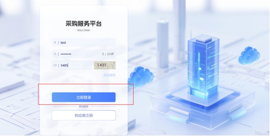 返回采購服務平臺登錄頁,輸入注冊的賬號密碼、驗證碼等,點擊“立即登錄”(如下圖)。