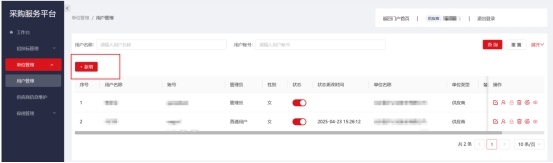 單位管理員登錄,點擊左側“單位管理”下“用戶管理”菜單,可為本單位新增多個普通用戶賬號(可以進行投標報名及報價)。